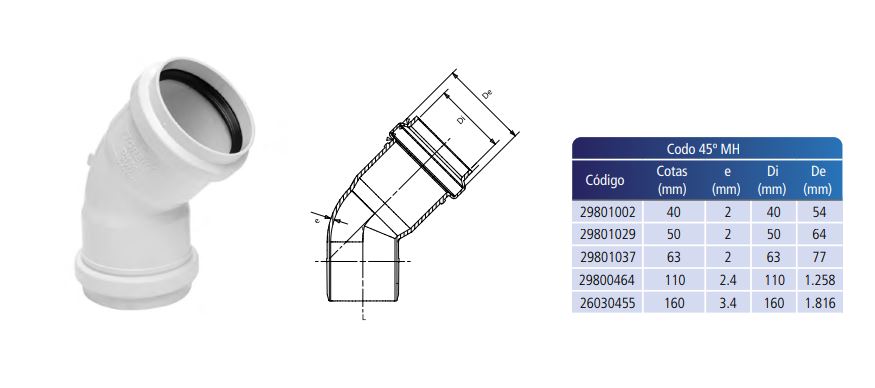 Codo a 45° PVC Macho Hembra 160MM Desagüe Junta Elástica, Tigre.