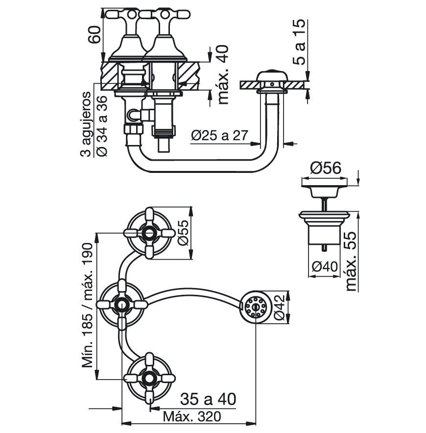 Caudal mínimo de alimentación de 20 lts por minuto (en conexiones fría y caliente): 5 lts por minuto.